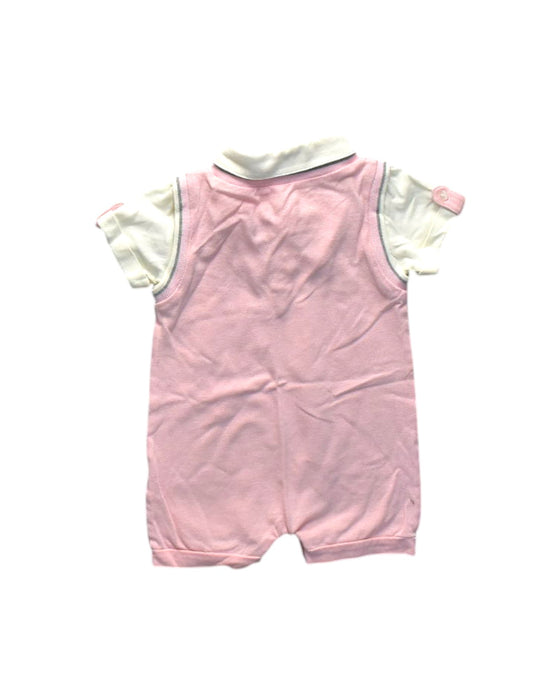 This charming Nicholas & Bears short sleeve romper for baby boys, sized 12-18 months, features a soft pink and cream color palette with a stylish bow tie detail, perfect for special occasions while promoting sustainable and circular fashion.